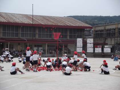 フレンドリー種目の玉入れは,1回戦の低学年の部では白組が玉をたくさん入れたのですが,2回戦の高学年の部で,まさかの大逆転。勝ったり負けたりと好勝負が続いています。
