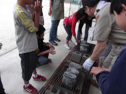運動場では,「みさきの家」にも来てくださるボーイスカウトの方と,飯ごうでご飯を炊く練習をしました。お米の計り方や飯ごうをコーティングして少しでもすすをとりやすくする方法,薪の組み方などを教えていただきました。初めて飯ごうを使う子も多く,話をしっかり聞いて一所懸命取り組んでいました。