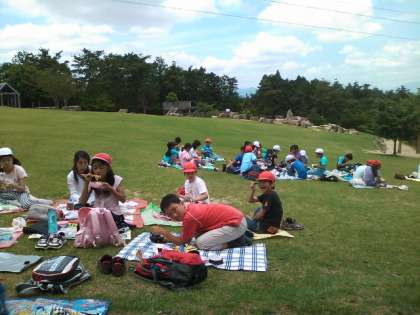 いっぱい遊んだのでおなかぺこぺこです。気持ちよいお天気の中,冒険の森で お弁当を食べました。