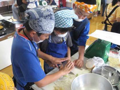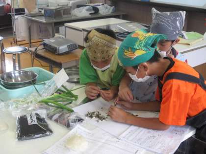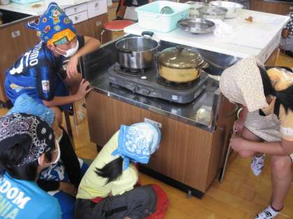 ご飯をガラスの鍋で炊いたので,班で炊きあがる様子を観察することにしました。お米が鍋の中で動くのでとても感動的で,お焦げができるまでを真剣に見入っていました。みそ汁も,煮干しのはらわたを一つずつ綺麗にとって出汁をとって作りました。