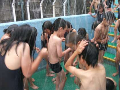 雑草をぬいて汗をかいた後は,待ちに待った水浴びです。汗をシャワーで流そう,と約束していたので,作業にもよりいっそう力がこもっていた2年生でした。あさってから始まる水遊びも楽しみですね!