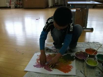 図工の時間に,「どろどろ絵の具」に取り組みました。液体紙粘土と絵の具を混ぜると絵の具がどろどろになります。それを手を使って,絵をかいていきました。最初はおそるおそるでしたが,だんだんと慣れてきて,すてきな絵ができあがりました。