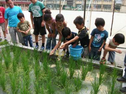 ぬかを一人ひとつかみずつまきました。「感触が気持ちいいな」「お米のにおいがする!」いろいろな感想を持ちながら楽しく作業をしました。この調子でどんどん大きくなっていくようにお世話しようね。
