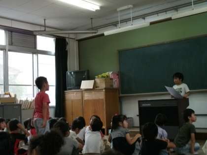 2年生は生活科の時間に,1年生に生き物紹介をしました。今,2年生はいろいろな生き物を自分たちで飼育しています。その生き物たちのことを1年生に紹介しました。1年生も2年生の発表を熱心に聞き,たくさんの質問をしていました。「どこでつかまえたんですか?」「何を食べるんですか?」「オスですか?」・・・次から次に質問が出てきます。その質問に2年生も一生懸命答えていました。