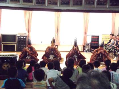 まず最初に,雅楽の成り立ちや楽器についての話がありました。その後,越天楽など雅楽の曲を聞きました。3年の子のおばあちゃんが演奏に参加されていたこともあり,子どもたちはとても静かにじっくり音色に聞き入っていました。丁度来られていたスクールガードリーダーの方も,「心が落ち着く音色ですね。」と言っておられました。