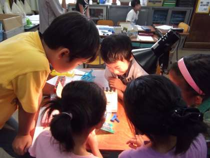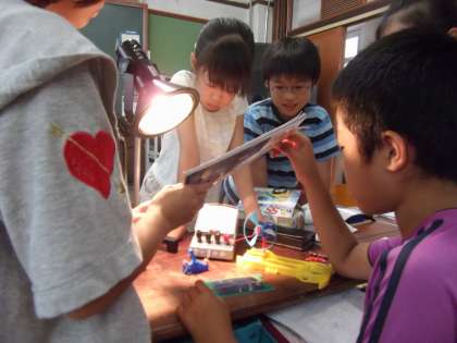 「電気を当てるとプロペラが回った。」「手を当てるとプロペラがゆっくり回るよ。」「本を当てて影にすると止まるかな。」「電流もゼロになったよ。」「透けた下敷きなら,どうなるだろう。」「電流も計ってみよう。」と次々に新しい疑問が出てきて活動が次々に展開していきました。楽しい理科の学習でした。