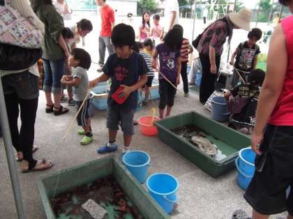 運動場では,サッカーコーナーにザリガニ釣り,迷路コーナーなど子どもたちも楽しんで参加しています。