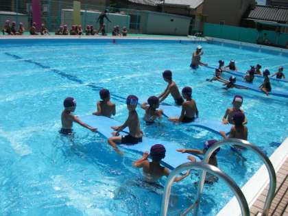 1,2年生は今日が最後の水泳学習でした。前回の授業で検定をしたので,今日はお楽しみプールでした。たからさがしでは,個人戦に加え,学年対抗戦も行いました。ほかにもビート板競争やリレーをして楽しみました。