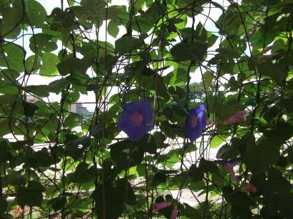 ツルレイシと同様,緑のカーテンにも花が咲きました。草丈ももうすぐ3階に手が届きそうなほどに成長してきました。生い茂った葉っぱで,カーテンの下にいると少しひんやり感じるようにもなってきました。一度温度を計ってみようかな。