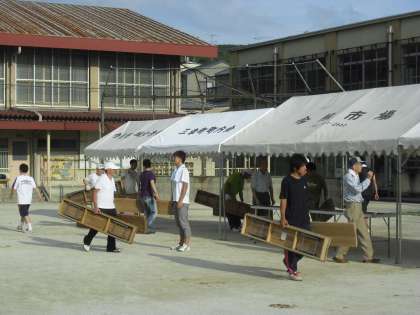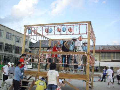 今日はその準備に、たくさんの地域の方々が来られました。テントを張ったり、櫓を建てたり提灯を飾ったりと、みんなで協力してどんどん、祭の用意が進んでいきます。