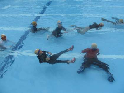 服を着たまま水に入ると,動きにくいだけでなく,衣服の重さに驚きます。普段自分が泳いでいるようには泳げなくなるということを体感し,水の事故から身を守ることがねらいです。もし誤って服を着たまま水に投げ出された時,無理に泳ごうとするのではなく,服に残った空気を利用し体を浮かすことが大切です。また,溺れている人を見つけた時,ペットボトルやスーパーの袋などが浮袋代わりなることも学びました。地上から浮く物を投げ,絶対に水に入らず,大声で助けを呼ぶことが二次災害を防ぎます。物を投げる側,水中にいて投げてもらった物を持って顔を水面に出して息の確保をする側に分かれて練習もしました。「少し水を入れた方が投げやすい。」「こんな少しの空気で浮けるんだ。」と驚いていました。