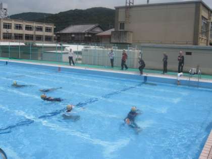 6年生は,服を着たままプールに入る「着衣水泳」を行いました。