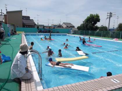 体育振興会の主催で学校のプール開放が行われました。真夏の太陽が照りつけるプールには絶好調の日よりで,普段は使えない浮き輪なども使えるので,参加した子どもたちは,水が気持ちよさそうに,笑顔いっぱいに水遊びを楽しんでいました。