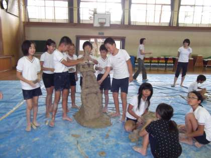 昨日の放課後,5年生が約1トンの粘土を倉庫から運びだし3つの山にしました。そして,初日の今日,1・2校時にその粘土を柔らかくつぶして,自分たちの肩の高さまで積み上げた『京都スカイツリー』など,イメージしたものを作っていきました。さすが5年生,昨日までの小さな固まりが,大きな造形物に仕上がっていました。