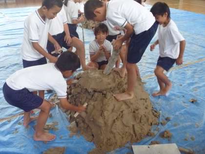 3年生の造形遊びは,『あったらいいな こんな町』というテーマで,自分たちが住んでみたい町づくりをしました。「町じゃなくて島になった。」と言いながらも,計画図を元に,グループで力を合わせて『町』を制作していました。
