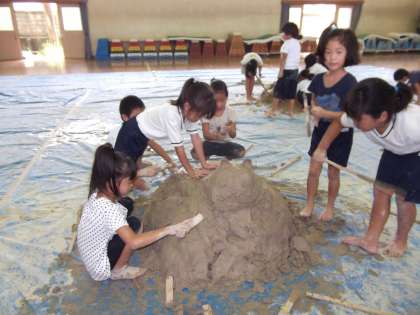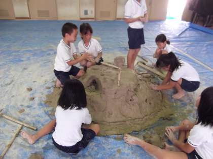 造形遊び2日目の最初は2年生。『人や動物を作ろう』と制作活動を始めました。「見て,トンネルを掘ったよ。」,「トトロの猫バスのように「大きな猫が出来たよ。」,「忍者村を作ってるねん。」と,自分たちの作っているものを弾んだ声で教えてくれました。