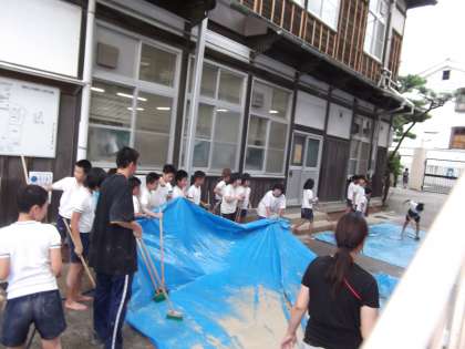 造形遊びをした後の片付けは,毎年6年生がします。1トンの粘土を1キロぐらいに切り出しナイロン袋に入れてたるにつめます。約1000個の袋になります。その後は,体育館に敷き詰めていたブルーシートを外に出してデッキブラシでこすり,粘土を洗い流します。今年の6年生もとてもよく働いてくれました。その活動はとても気持ちのよいものでした。