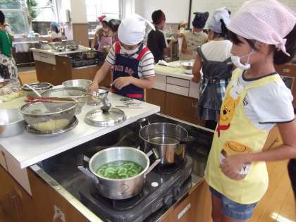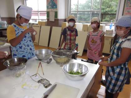 理科の観察学習で育てたツルレイシ(ゴーヤ)が見事に繁り,実がたくさんできました。4年生は,大量の収穫を祝って,ゴーヤとマカロニのサラダ作りをしました。