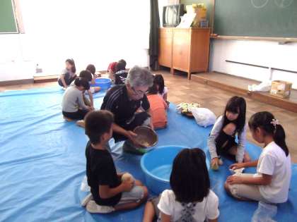 「すり鉢に籾を入れて,ソフトバールで擦ると籾が外れます。外れたと思ったら持って来て。籾殻を吹き飛ばします。」と言われて始めました。長谷川さんに持っていくと上手に籾殻を吹き飛ばしてくださいました。しばらくすると,あちらことらですり鉢を吹き出す子どもがでてきました。顔に籾殻がかかったり,目に入ったりして,子どもたちはびっくり。長谷川さんが「コツは,すり鉢の端から息を吹きかけるんだよ。」と教えてくださいました。子どもたちもだんだんとコツがつかめたようで上手になってきました。