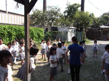 丁度中間休みになったので,小学生の子どもたちも集まって来て,永興保育園の先生や子どもたちが来てくれたことを喜んでいました。楽しい交流の出来たひと時でした。
