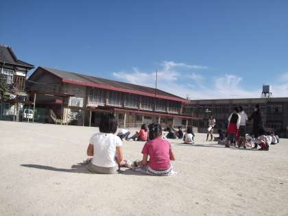 秋晴れのよいお天気のもと,4年生が理科「月」の学習で,半月の観察をしていました。「午後2時半,体育館の上,にぎり拳1つ分の所に出ている。」と観察カードに描き込んでいました。