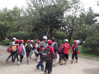 清水寺では,秋の観光シーズン,修学旅行生など,たくさんの人がいっぱいの中,赤白帽の子どもたちが元気に到着しました。朝は,元気いっぱいの子どもたちでした。昼食は12時ごろに御所で食べる予定でした。しかし,なかなか姿が見られず,午後1時を過ぎてやっと到着する班もありました。南禅寺に行くのに随分迷ったようです。午後からも,バスの時刻が合わずに,長い距離を歩いた班も…。