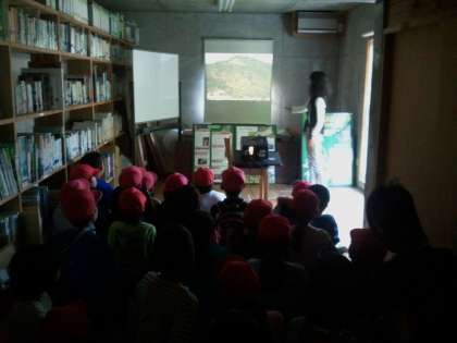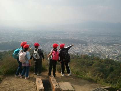 登山の前に,「森のセンター」で大文字山の生き物などの話を聞きました。ムササビやフクロウ,見たことのないキノコなどの写真を見せてもらって子ども達は大興奮,教えてもらった物を見付けようと,あちこち探しながら登りました。頂上まで行くまでに,栗や不思議なものを見つけてみんなで大喜びしました。とってもよいお天気で火床「大の字」の上から京都市内がはっきり見え,社会科のよい学習にもなりました。