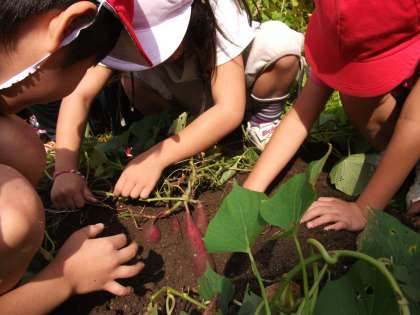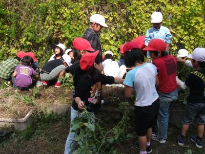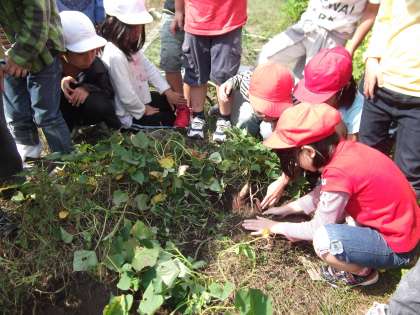 1年生が,サツマイモ掘りをしました。始めのツルには,大人のこぶし大のお芋が3〜4個ついていました。少し小さいなあと思っていましたが,次に掘ったお芋はとっても大きくて,子どもの顔ぐらいの大きさでびっくりしました。お芋が出てくるたびに,子ども達から歓声があがっていました。大小取り混ぜて30個ほどのお芋が収穫できました。食べるのが楽しみです。