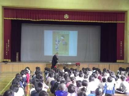 11月の朝会での話は,『読書月間』にちなんだものでした。各教師のお薦め本を,クイズ形式で紹介していきました。子ども達は大盛り上がり,「この本は○○先生が前に読んでくれたし,○○先生や。」…「え!違った。△△先生やった。」,「へえ,あの本好きなん。先生意外!」などと,とても興味を持っていました。
