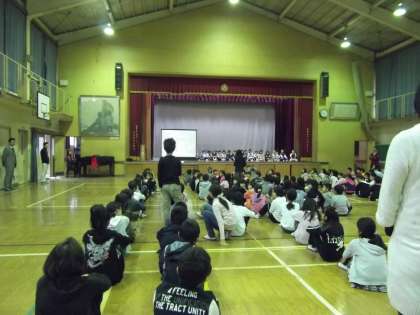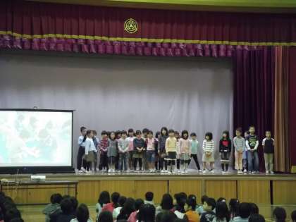 2年生の感動体験発表会がありました。2年生は,「お米づくり」をしたことを,全校のみんなに伝えていました。たくさんの保護者の方々も来校してくださって,2年生の児童は少し緊張した様子も見られましたが,身ぶりをつけながらがんばって発表していました。最後に,お米づくりの様子を,「子犬のビンゴ」の曲で替え歌にして表現していました。