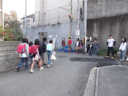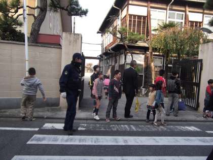今週は,今熊野小学校11月の人権・あいさつ週間です。今月はフレンドリーグループ,11・12班が当番です。当番の子ども達は,登校してくる友だちに大きな声であいさつをしていました。今日は,東山署泉涌寺交番のおまわりさんも来られ,一緒に子どもたちの登校を見守ってくださいました。