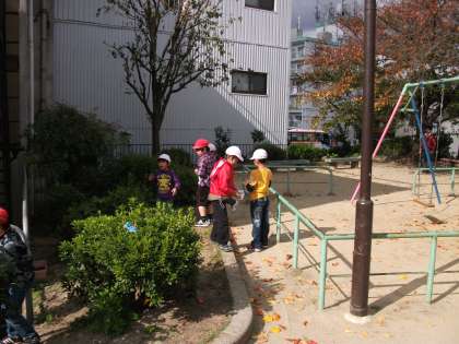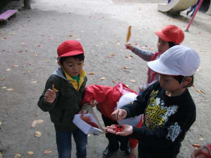 生活科の時間に秋見つけに行きました。1年生は宝蔵公園へ行きました。夏にも同じように宝蔵公園に来ている1年生。葉っぱが一枚一枚色が違うことを発見したり,夏に咲いていた花がいつの間にか実になっていたり,いつも遊んでいる公園でたくさんの「秋」を見つけられました。秋見つけをしたあとは,公園の遊具で遊んだり,とても楽しい時間を過ごしました。次は太閤坦に行く予定です。次はどんな秋に出会えるでしょうか?楽しみですね。