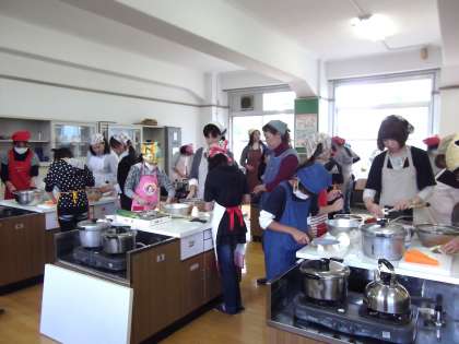 11月16日(水)「山の家」宿泊学習で計画している野外炊事の練習として,家庭科で豚汁作りに挑戦しました。PTA学年懇親会も兼ねて行いました。