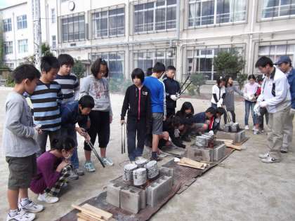 たくさんの保護者の方に教えていただきながら,人参や大根,コンニャク,お肉等々を上手に切っていました。「包丁上手に使うね。」と褒めてもらって,ニコニコ顔で豚汁を作りました。また,飯ごうを使ってのご飯炊きもしました。加藤さんをはじめボランティアの方3人に来ていただき,火のおこし方や飯ごうのコーティングの仕方を教えていただきました。加藤さんには「山の家」にも来ていただきお世話になります。「さすが5年生,火起こし上手だったのですぐご飯が炊けました。」と加藤さんがおっしゃっていました。とても美味しく豚汁もご飯もできあがりました。