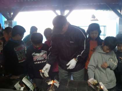 7時半からは第1炊事場で、パックドック作りを楽しんでいます。火をつけるのに奮闘していますが、美味しく焼けていい顔で食べています。