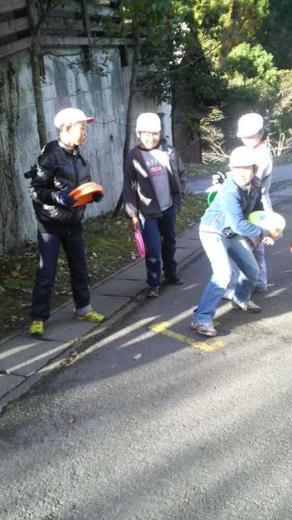 「山の家」のお天気はとてもいいですが,風があり少し寒く感じます。フライング-ディスクゲームは,風があり,なかなか思い通りにはいきません。しかし,子どもは風の子,寒さに負けずとても楽しそうに活動しています。