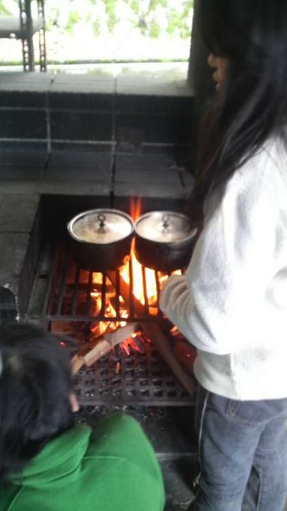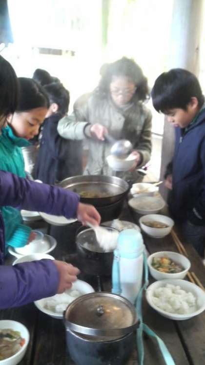 4日目のお昼は,3校合同班での野外炊事「豚汁づくり」です。煙にもめげず,寒さにもめげず,3校の仲間で協力しあって調理しました。今熊野小では,先日懇親会を兼ねて親子で豚汁作りをしました。他の2校も家庭科で事前に調理実習をしたそうです。その成果もあって,とっても美味しい豚汁ができあがりました。