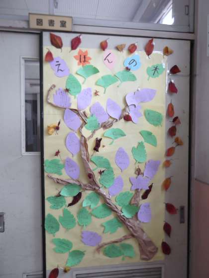 「読み聞かせ」ボランティアの方々が,11月の読書月間で,子ども達がたくさん本を読んでくれるようにと,「絵本の木」を作ってくださいました。葉に子ども達が読んだ本の紹介や感想を書いて,貼っていきます。図書室の扉の木は,葉がいっぱいになりました。次は,体育館側面の木です。12月と月は変わりましたが,続けて本を読んでいってほしいです。