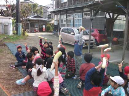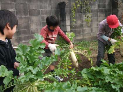 予想以上の大きさに「すごい!」と感動していました。そしてきれいに洗った大根の根っこをかじってみました。「から〜い!」「ぴりぴりする!」新鮮な大根の味を体験することができました。明日,この大根を調理し,みんなでいただく予定です。