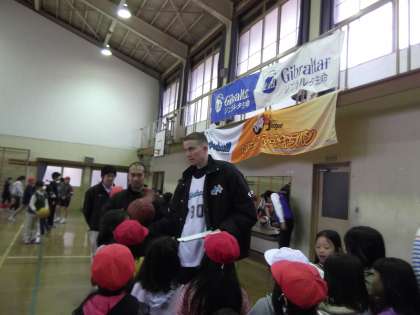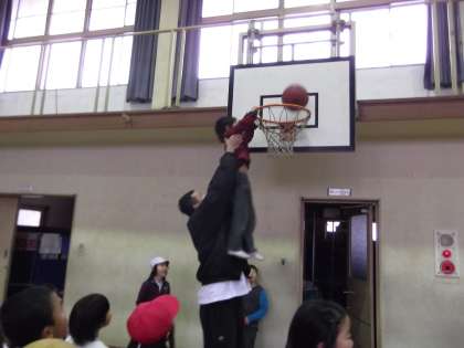 中間休みに,京都ハンナリーズの選手がサインをしてくれると聞いて,5・6年生以外の子も喜んで体育館に集まりました。ノートにサインしてもらったり,抱えてもらってゴールにボールを入れたりして,とっても喜んでいました。