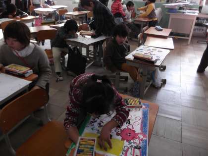 1年生は,野菜やおうちから持ってきたいろいろな物を使って,画用紙にスタンピングをしました。今日は,押した型が何に見えるかを考えて,スタンピングをしたところに絵を描き加えていきました。子ども達はとても楽しんで絵を仕上げていました。