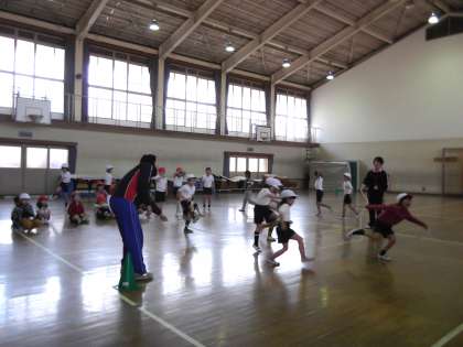 1年生が,体育で大縄跳びをしました。始めに,縄をヘビのようにくねくねと動かして跳びました。次に,波のように動かして跳びました。上手に跳べて大喜びする子や,なかなかうまく跳べず,みんなにリズムをきざんで応援してもらったりする子もいました。やっと跳べると,子ども達の中から自然に拍手が起こり,クラス全員がニコニコ笑顔になりました。