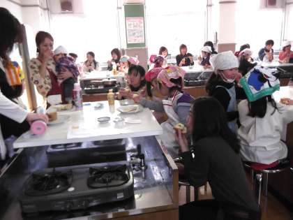 1年生は,自由参観5・6時間目に,親子親睦会の「蒸しパンづくり」をしました。1年生の子どもたちが,大切に育てみんなで収穫したサツマイモを使って作りました。家庭科室いっぱいにいいにおいが満ちていました。子ども達も,「おいしい,おいしい。」と連呼して笑顔いっぱいでした。