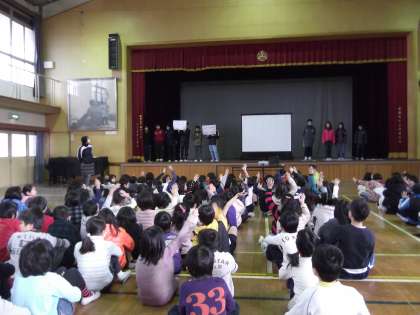 給食週間の取組に1つとして,給食をテーマにした朝会をしました。給食委員会の子どもが,給食の出来方などの話をした後,食についてのクイズをしました。全校の子ども達,楽しみながら給食について知りました。感想でも「給食のいろいろなことが分かってよかった。」という意見がでていました。給食週間には,豆つまみ大会や牛乳パックつめ競争,交流給食なども行います。また,各学級でも給食や自分達の食べている『食』について見直す話し合いをし,感想を言葉に表す取組もします。