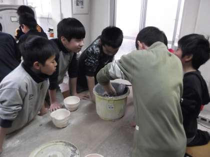 6年生が,匠に指導してもらって作った茶碗の素焼きが終わりました。一部剥がれたりかけたりしたところがあったものの,どうにか全員割れずに焼きあがりました。