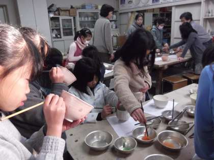 お客様をもてなす茶碗ということで,子ども達は下絵もとても丁寧に描いてきていました。作業中も真剣そのもの,とても集中して絵付けをしていました。どの子もとても上手にできていました。「このお茶碗欲しい,売ってといわれるかもしれないよ。」と指導者の方から言ってもらって,とても喜んでいました。