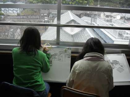 5年生が,図画工作で,今熊野小学校から見た風景を絵に描いています。家や屋根の重なりをよく見て,とても丁寧に一つずつ描き加えていました。