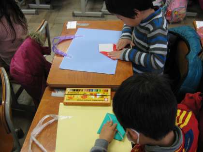 今日は,来年度の新一年生の入学説明会,体験入学がありました。体験入学では,最初少しドキドキした様子も見られましたが,みんなで自己紹介をしあったり,歌やダンスを踊っているうちに元気が出てきました。一生懸命,読み聞かせを聞くこともできました。おりがみでカメラを作って,お友達とカメラごっこもしました。最後にはお絵かきもしました。夢中で思い思いの絵をかいていました。