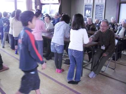 3年生は,まず始めに,『友だちになるために』という歌を,手話を入れて歌いました。次に,『思い出のアルバム』の曲を,いろいろな楽器とリコーダーで合奏しました。 その後,おじいちゃんおばあちゃん達と握手をしました。全ての方が子どもたちの握手を待って手を出してくださって,子ども達もはにかみながらもとてもいい笑顔を見せてくれる,会場が温かくなる瞬間です。最後に,3年生は,社会科『昔のくらし』の学習で,おじいちゃんやおばあちゃん達に昔使った道具についてインタビューをさせてもらいました。「昔は,家にお風呂がなかったから,お風呂屋さんに行っていたんだよ。」とか,自分から積極的に話してくださる方もいました。3年生の子ども達,洗濯板や七輪体験はしましたが,実際の生活体験を聞けて,とてもよい学習になりました。
