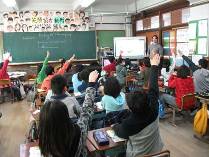 5・6年の英語学習がありました。京都市では,年間何回か外国の方が講師で来て,子ども達にネイティブな英語で授業をしています。今回は,今熊野での本年度最後の英語授業でした。6年生は,英語での職業の言い方を知り,将来自分がなりたい職業とそのわけを英語で交流していました。自分がその職業を選んだ理由を英語で言おうと,子ども達一生懸命考えていました。5年生は,食べ物の言い方を知り,今日食べてきた朝ご飯を言い合って大盛り上がりでした。とても楽しい授業でした。